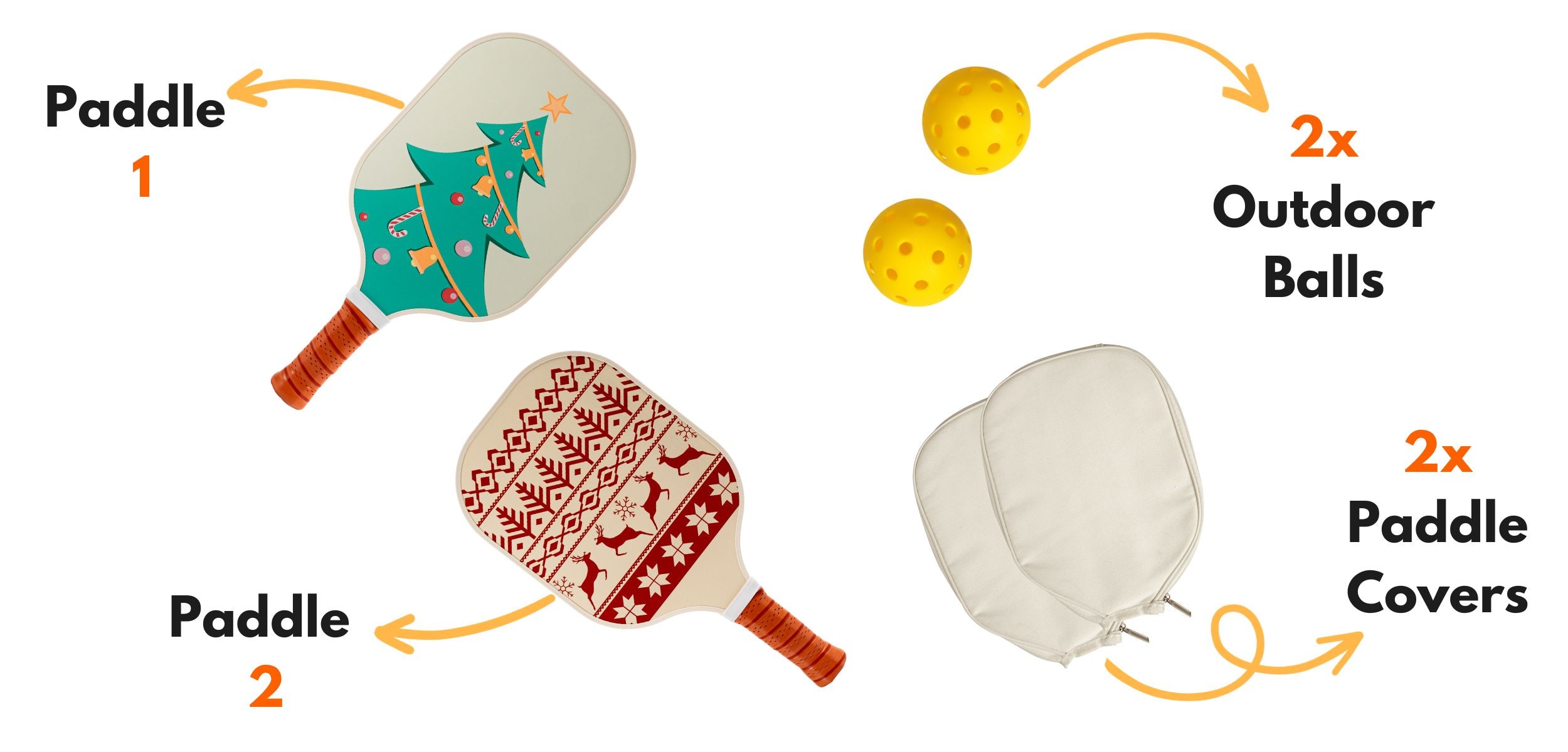 Our pickleball kits include 2 paddles, 2 pickleballs, and 2 covers – making them an ideal starter kit or as a gift set for someone getting into the game.