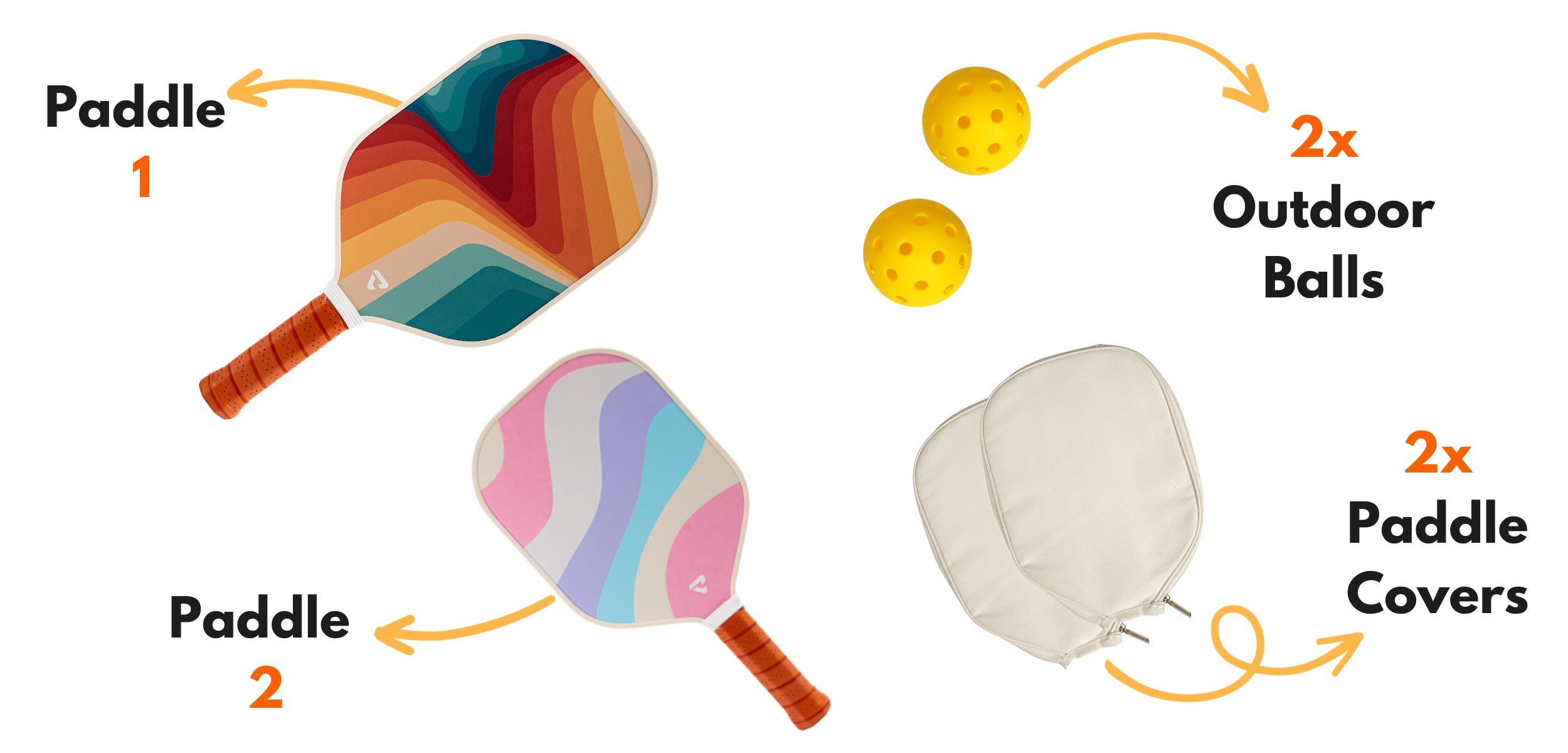 Our pickleball kits include 2 paddles, 2 pickleballs, and 2 covers – making them an ideal starter kit or as a gift set for someone getting into the game.